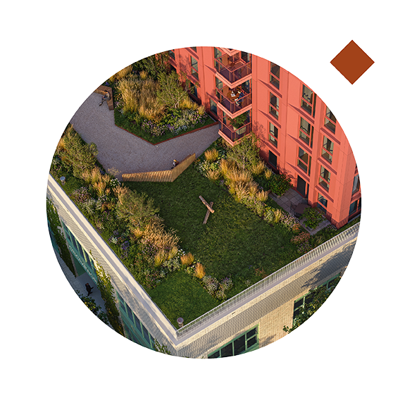 “Dat het een plek is waar mensen elkaar kunnen ontmoeten. Het wandelpad in de daktuin varieert in breedte en krijgt op diverse plekken bankjes met een hoge rugleuning, voor extra beschutting. Als je in de tuin bent, kun je vanuit verschillende hoeken de gehele tuin ervaren. De verschillende plekken zijn met elkaar verbonden door een uitgekiende keuze van struiken, planten, bloemen en grassoorten. Daar waar bewoners niet kunnen komen, ontstaat rust voor insecten en vogels. De lange pergola zorgt voor geborgenheid en een groene afscheiding met de buren. Met spots in de grond is er een knipoog gemaakt naar het sterrenbeeld Orion, welke vanuit de hoger gelegen woningen te herkennen is.”