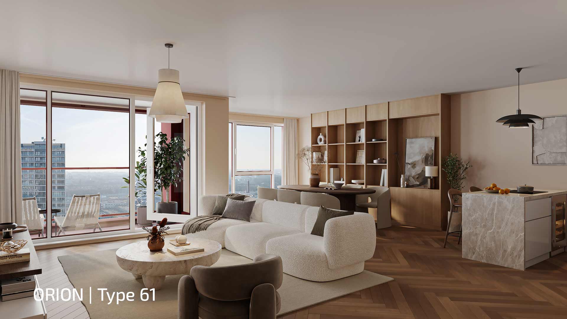 Type: 45, 46, 51, 52, 53 en 61 Grootte woning: 96 tot 151 m2 Aantal slaapkamers: 2 of 3 Buitenruimte: Loggia Te vinden op woonlaag: 20 Inclusief: sanitair & tegelwerk in badkamer en toilet Inclusief: (vloer)verwarming en koeling